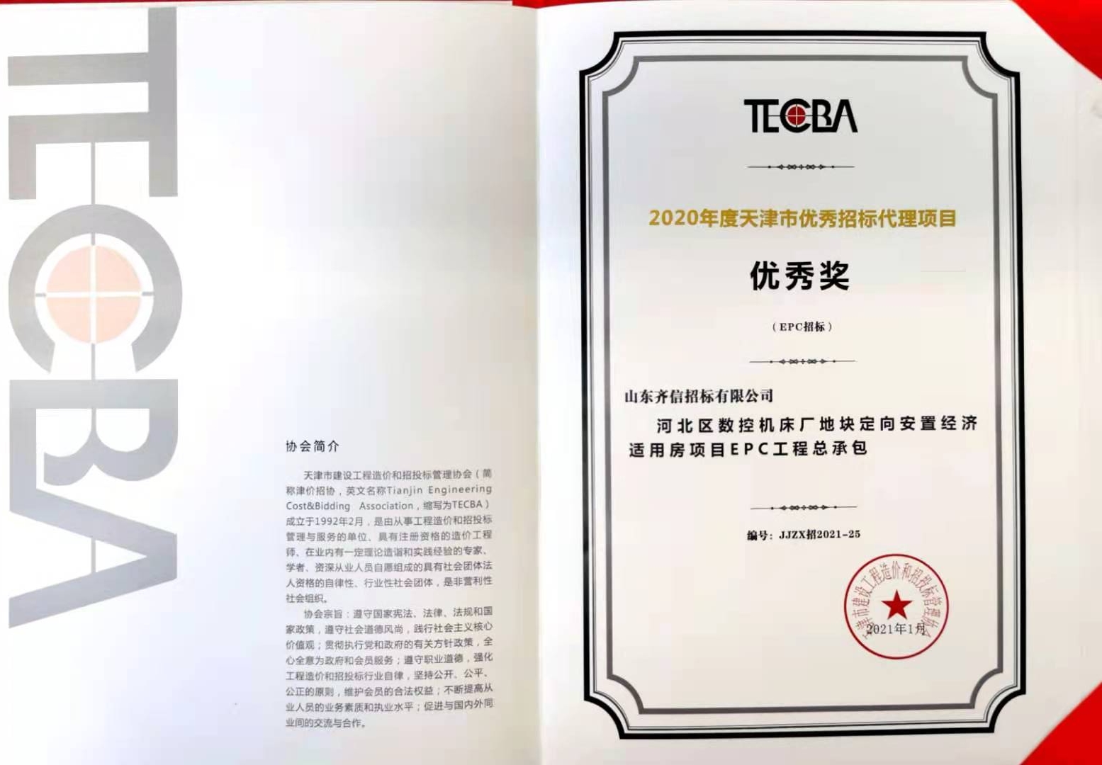 2021年1月,天津市建設(shè)工程造價和招投標管理協(xié)會公布2020年度天津市“優(yōu)秀招標代理項目”、“優(yōu)秀政府采購代理項目”,齊信天津分公司的“河北區(qū)數(shù)控機床廠地塊定向安置經(jīng)濟適用房項目EPC工程總承包”入選優(yōu)秀招標代理項目,“天津大學(xué)23、24齋修繕工程”入選優(yōu)秀政府采購代理項目。
